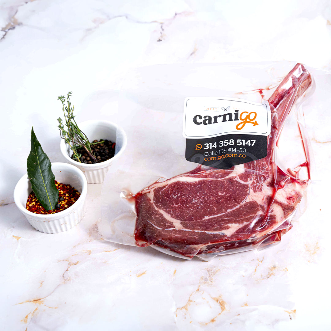 El corte premium de bone-in rib eye es una joya apreciada por los conocedores de la carne. Este corte se extrae del lomo de la res, incluyendo el hueso costal que aporta una riqueza adicional al sabor cuando se cocina. La carne del rib eye es famosa por su marmoleo generoso, esa grasa intramuscular que se funde y se infiltra en el músculo durante la cocción, ofreciendo una textura jugosa y un sabor insuperable.